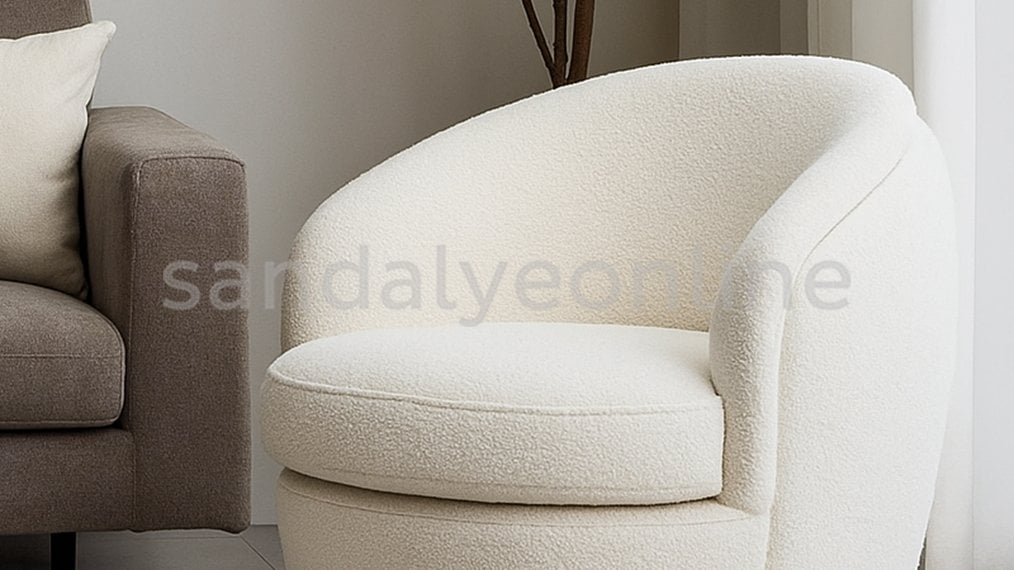 The Coi Rotating Armchair combines modern design, teddy fabric upholstery, and the stylish comfort of a pouf in a unique model. Its low-to-the-ground structure makes it safe and practical even for small children, while offering functional seating in both residential and commercial spaces. With its stone color tone and metallic details, it adds a luxurious touch to interiors, elevating the overall décor. Designed with an easy-to-clean fabric, ergonomic form, and extra cushion support, the Coi Swivel Armchair ensures lasting comfort during long seating sessions. It is a refined complement to cafés, restaurants, hotels, or home interiors.