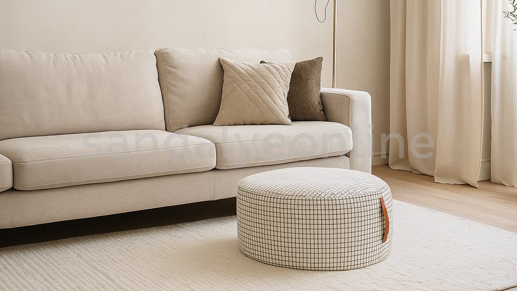 The Davul Pouf is a cheerful and stylish round pouf model that adds character to any room with its elegant fabric upholstery and playful silhouette. Designed with a spacious seating surface, high-quality grey foam filling, and a removable leather carrying handle, it is easy to move and provides a practical solution as either extra seating or a decorative accent. Standard upholstery comes in a smooth plaid fabric, but it can be customized in different colors and fabrics to suit your décor.