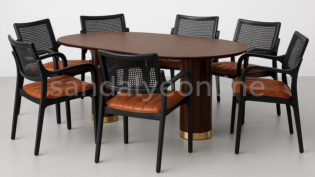 The Fier Upholstered Chair combines elegance and comfort in a refined design, making it an ideal choice for both homes and professional spaces. With its solid wooden frame, faux leather upholstery, and rattan weave detail on the backrest, it adds a natural yet modern touch to your décor. Its armrests and wide seating surface ensure extra comfort during long use, while multiple color and finishing options allow for full customization. Adaptable to both classic and modern interiors, the Fier Chair is a long-lasting piece crafted with Sandalye Online quality.