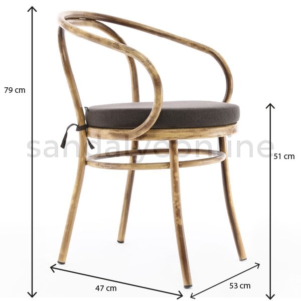 The chair’s dimensions are 79 cm in height, 53 cm in width, 47 cm in depth, with a seat height of 51 cm.