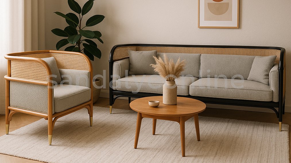 The Gloria Hazeran Armchair is a unique design that fits seamlessly into both modern and nostalgic interiors. The rattan detail on the backrest adds a natural and warm touch, while the comfortable seating area ensures enjoyable use over long periods. Its single-seater form makes it a versatile piece, ideal for living rooms, cafés, or summer houses.