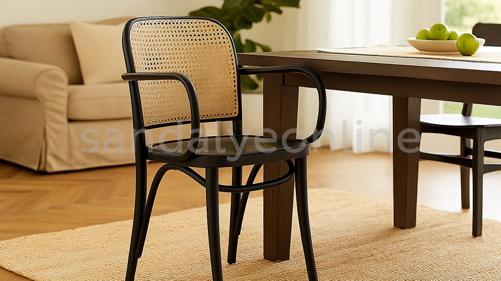The Lina Hazeranlı Wooden Chair with Arm Black brings together the timeless elegance of natural woven rattan and the refined craftsmanship of steam-bent wood. Enhanced with a sleek black lacquer finish, this armchair offers durability and sophistication, making it a perfect addition to both classic and modern interiors. With its armrest design, it combines elegance with comfort, ensuring a stylish seating experience for any space.
