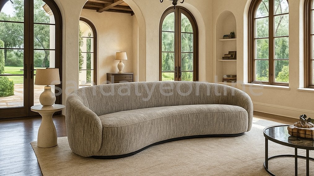 The Maddock Sofa enhances modern living spaces with its elongated oval form and soft textured fabric, adding a sophisticated touch to any room. With its minimalist lines, this sofa combines both comfort and elegance, making it a valuable addition to residential or commercial interiors.