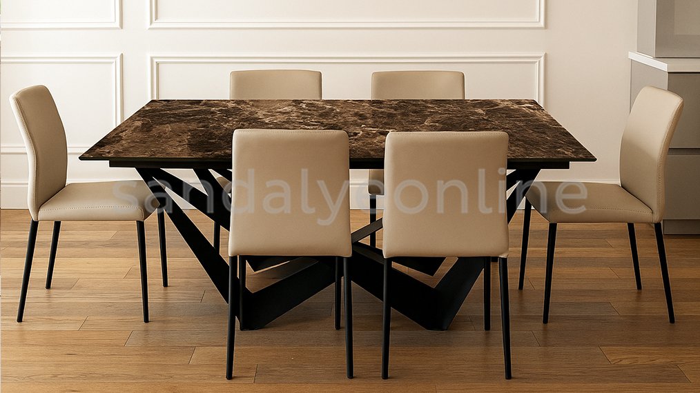 Combining elegance and durability in interior décor, the Marble Dining Table Brown- Diamond brings a modern character to your living spaces with its distinctive diamond-shaped leg design. The natural marble tabletop, featuring unique veining on a rich brown surface, delivers both simplicity and luxury, while the geometric black metal legs add a bold and contemporary touch. Designed for those seeking a standout piece, this table offers both striking aesthetics and functional use in dining rooms, living areas, offices, or restaurants.