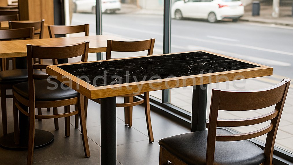 The Matte Double Cafe Table offers both aesthetic appeal and functional use with its modern design and durable structure. Featuring a black marble-patterned surface with wooden frame details, this model combines style and comfort in various settings such as restaurants, cafés, hotels, or offices. Designed for long-lasting use, the Mat series can be safely used in both indoor and outdoor areas (provided it is protected from heavy rain and moisture). Its spacious surface accommodates seating arrangements from two up to four people.