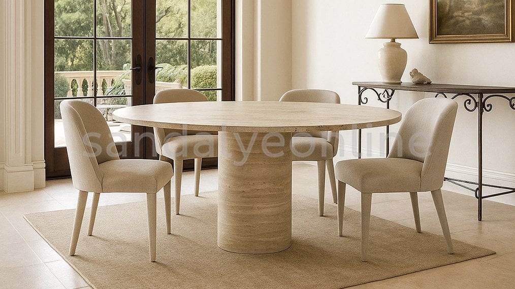 The Montana Travertine Dining Table offers a modern alternative to traditional dining tables with its cylindrical pedestal base supporting a round tabletop. Crafted from natural travertine stone, this elegant piece combines durability with timeless sophistication, making it the perfect centerpiece for dining rooms, kitchens, and open spaces. Its minimalist design and solid structure ensure functionality for both everyday use and special gatherings.