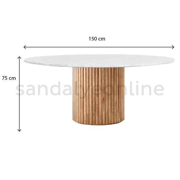The Pure Kitchen Table Natural 150 Diameter brings modern elegance to your living spaces with its circular form and refined design. Featuring a low profile, this unique model differs from traditional dining tables by offering an aesthetic structure reminiscent of a coffee table. The marble top is easy to clean, stain-resistant, and maintains its elegance for years. Appealing to minimalist, modern, and luxury décor styles, the Pure table can be safely used in both indoor and outdoor settings. When paired with poufs or metal-detailed chairs, it creates a sophisticated atmosphere in any space.