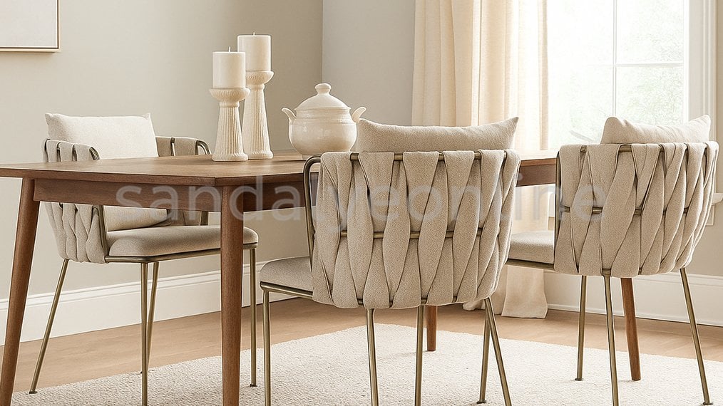 The Rope Braided Cover Chair s designed to bring the refined beauty of woven-look seating into your living spaces. Perfect for creating an inviting atmosphere, this model adds a sophisticated touch to dining room sets and guest seating arrangements. The seat and backrest are surrounded by fabric upholstery featuring a stitched woven pattern, offering a comfortable structure with armrests and an upright backrest. The use of lighter and darker tones of the same color between the seat frame and surrounding piece creates an elegant contrast, giving the chair a modern, high-end appearance.