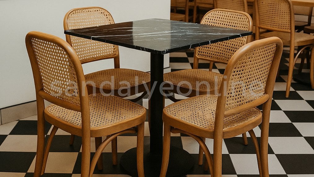 The Soign Marble Hotel Restaurant Table is a stylish solution that combines aesthetics and functionality, specially designed for restaurants, hotel dining areas, and cafés. Its 70x70 cm marble tabletop, with elegant natural patterns, brings a luxurious atmosphere to interiors, while the black funnel-shaped metal legs provide a modern and sturdy presence.