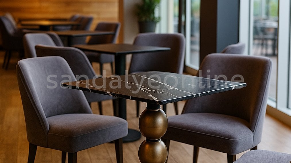 The Tour Marble Table is a stylish and durable model specially designed for restaurants, hotel dining areas, and cafés. Featuring a 70x70 cm marble tabletop and custom-designed polished gold layered ball-shaped legs, it combines elegance with modern luxury. The refinement of natural marble, blended with contemporary design and golden accents, brings a sophisticated atmosphere to any interior.