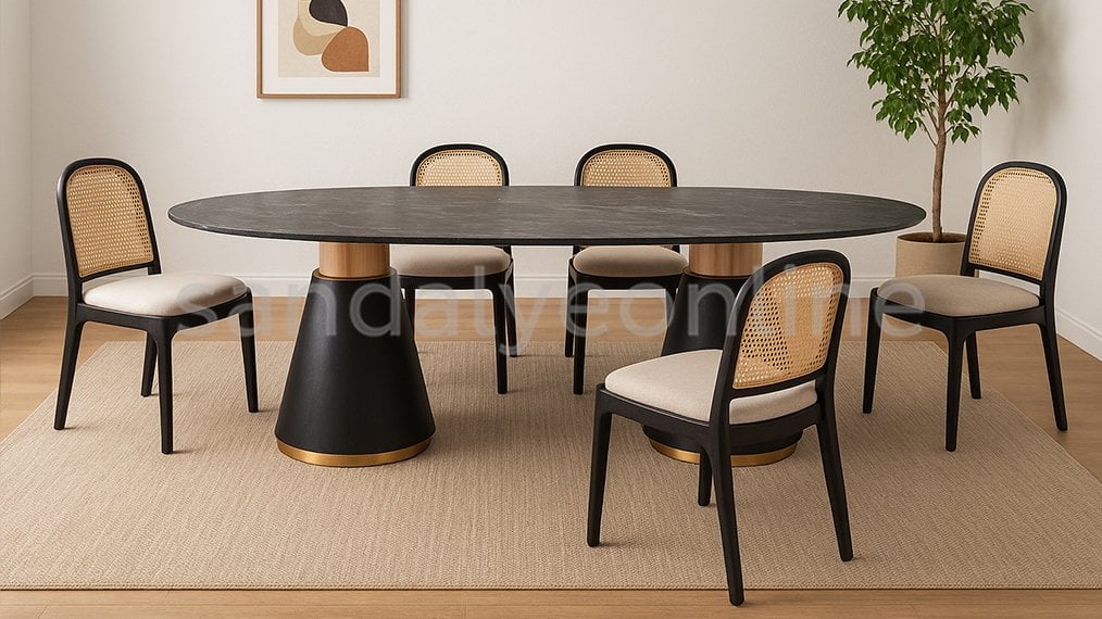 Banel Masa, zarif tasarımı ve dikkat çekici detaylarıyla yemek odalarına, mutfaklara ve ticari mekanlara sofistike bir hava katar. Beyaz mermer üst yüzeyi lüksün ve şıklığın sembolü olurken, altın metal tabanı modern tarzı tamamlayarak masaya göz alıcı bir görünüm kazandırır. Bu kontrast renkler, mekâna ferahlık, aydınlık ve zarafet katarken aynı zamanda modern bir şıklık sunar.
