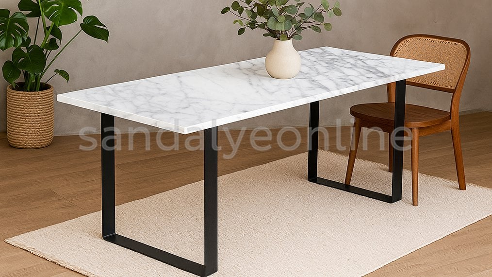 Estetiği ve sağlamlığı bir araya getiren Mermer Yemek Masası Beyaz - Kare, yaşam alanlarınıza sofistike bir dokunuş kazandırmak için tasarlandı. Modern dekorasyonun vazgeçilmez parçalarından biri olan bu masa, sade şıklığıyla dikkat çekerken dayanıklı yapısıyla da uzun ömürlü kullanım sunar. Yüzeyde kullanılan doğal mermer, zemin üzerinde yer alan damar detayları ile her ortama zarif bir hava katar. Siyah mat elektrostatik boyalı kare metal ayakları, masa tasarımına dengeli bir görünüm kazandırırken sağlam duruşuyla fonksiyonellik sağlar.