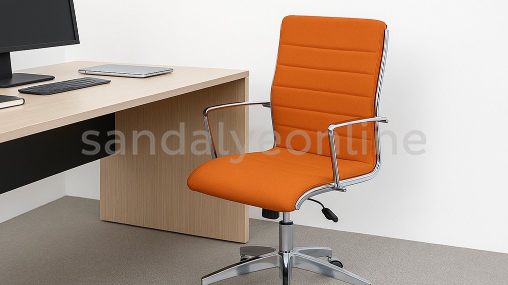 On Çalışma Sandalyesi, krom iskeleti ve zamansız tasarımıyla modern ofis mobilyaları arasında öne çıkan şık bir modeldir. Dayanıklı yapısı, ergonomik özellikleri ve oranj rengiyle dikkat çeken bu sandalye; hem home office düzenlerinde hem de kalabalık ofis alanlarında konforlu bir kullanım sunar. 360° dönebilen tekerlekleri, ayarlanabilir yüksekliği ve arkaya yaslanabilen esnek sırt desteği sayesinde uzun süreli masa başı oturumlarda ergonomiyi garanti eder. Şıklığıyla ofis dekorasyonunuza prestij katarken, güçlü yapısıyla 300 kg’a kadar taşıma kapasitesi sunarak uzun ömürlü bir çözüm sağlar.