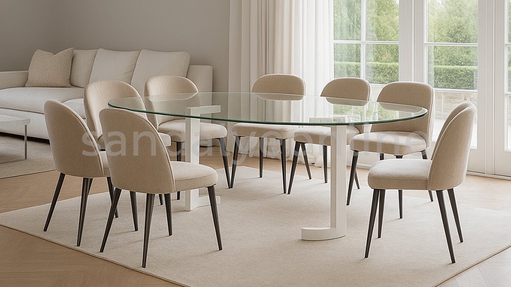 - Masif gövdesi, cam tablası ve sade çizgileriyle ahşap, metal veya modern sandalye çeşitleriyle uyumlu kombinler oluşturur.