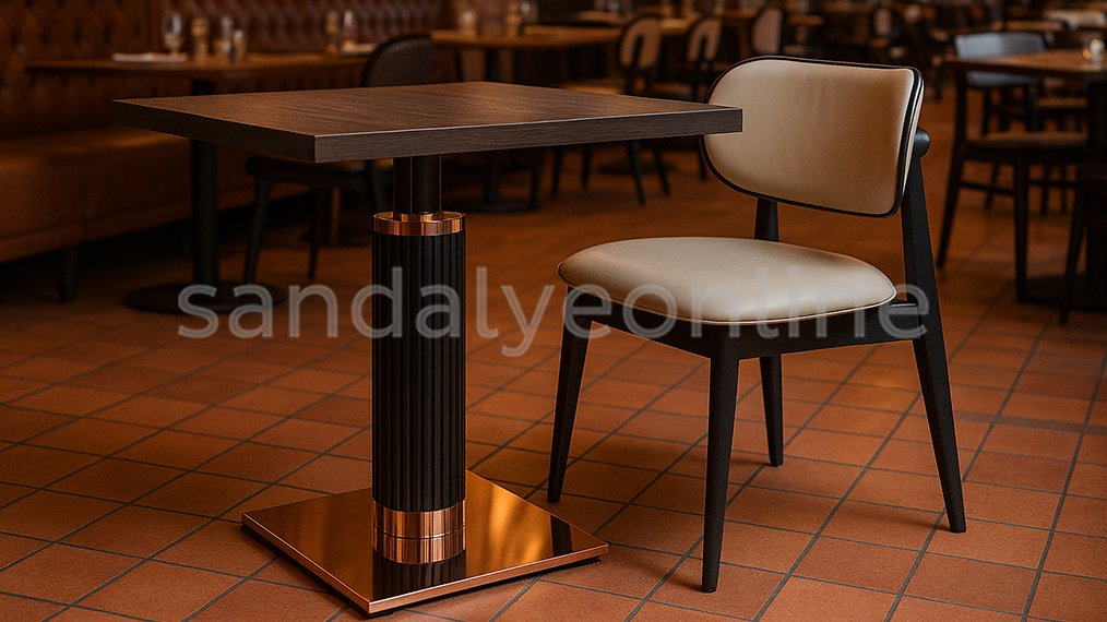 Rapides Ahşap Marküteri Satine Detay Masa, restoranlar, otel restoranları ve kafeler için özel olarak tasarlanmış zarif bir modeldir. 70x70 ve 80x80 cm ölçülerindeki kare tabanı, parlak bakır (rose) rengi ile dikkat çekerken, ahşap çıta detayları ve marküteri tabla ile mekânlara nostaljik bir atmosfer katar. Metal ve ahşabın uyumlu birleşimi sayesinde hem modern hem de vintage dekorasyonlara kolayca uyum sağlar. Parlak yüzeyi, estetik görünümü ve sağlam yapısıyla uzun ömürlü bir kullanım sunar.